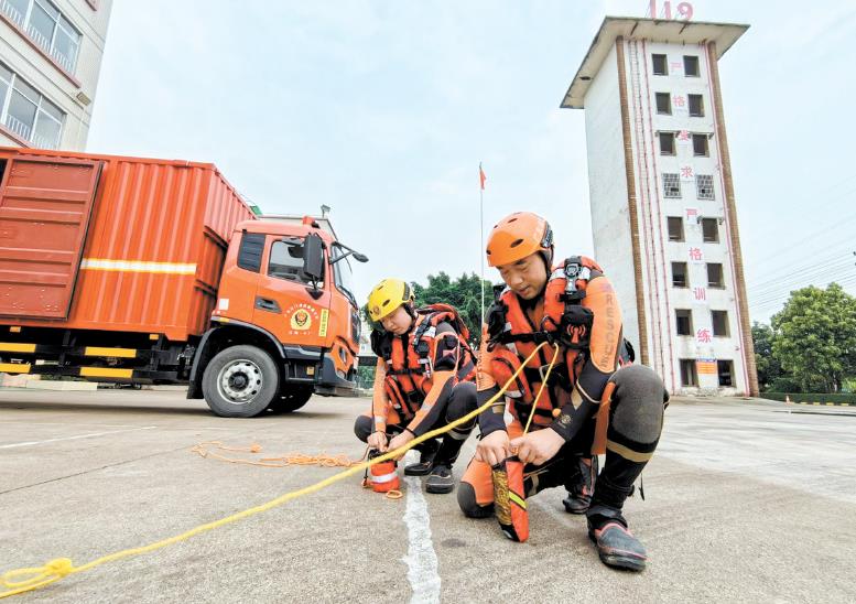 消防救援隊伍對防汛裝備器材、救援物資等進行檢查。