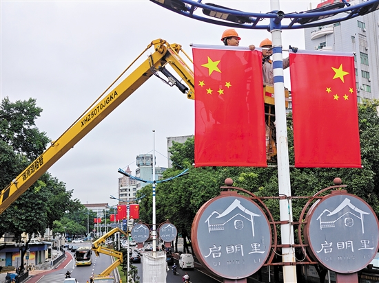 ????記者昨日在躍進(jìn)路、啟明里、蓬江大橋一帶見(jiàn)到,城管部門(mén)工作人員正開(kāi)著幾輛路燈工作車(chē),給路燈桿懸掛國(guó)旗,很快,街頭上一面面鮮艷的五星紅旗迎風(fēng)招展。