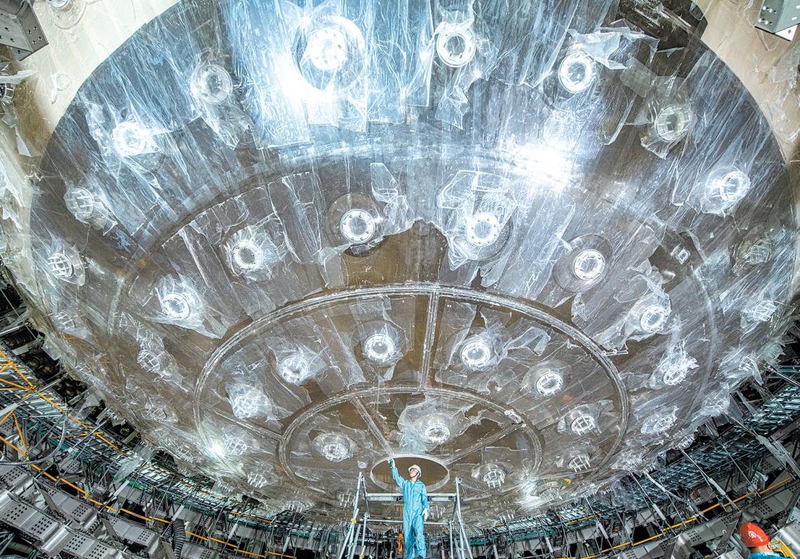 ????江門中微子實(shí)驗(yàn)室作為中國(guó)科學(xué)院和廣東省共同建設(shè)的大科學(xué)裝置,是我國(guó)主導(dǎo)的大型國(guó)際科學(xué)合作項(xiàng)目,以測(cè)定中微子質(zhì)量順序、精確測(cè)量中微子混合參數(shù)為主要科學(xué)目標(biāo),并進(jìn)行其他多項(xiàng)科學(xué)前沿研究。其核心探測(cè)設(shè)備是一個(gè)位于地下700米的液體閃爍體探測(cè)器,探測(cè)器放置在地下實(shí)驗(yàn)大廳內(nèi)一個(gè)44米深的池子中央,由直徑41.1米的不銹鋼框架、直徑35.4米的有機(jī)玻璃球,以及2萬(wàn)噸液體閃爍體、4.5萬(wàn)個(gè)光電倍增管等關(guān)鍵部件組成。