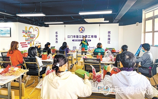 蓬江區(qū)零工市場(chǎng)為求職者提供“一站式”服務(wù)。圖為群眾參加新春福桶擺件制作培訓(xùn)。
