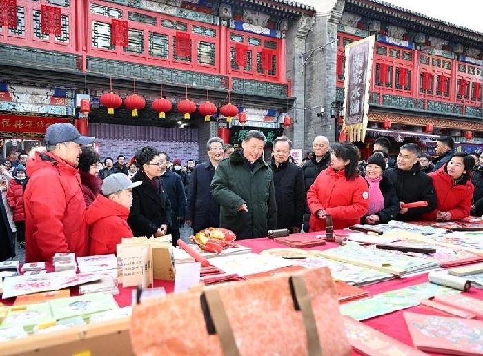 2024年春節(jié)前夕,總書記來到天津古文化街。在泥人張店鋪,他仔細觀看手藝人修復“孔子撫琴”的泥塑,感慨道:“一代代接續(xù)的工匠精神,讓文脈得以綿延不息。”在街邊的楊柳青木版年畫店鋪,他端詳“勾、刻、印、繪、裱”道道工藝,贊賞道“連年有余,寄托了人們對美好生活的向往”。