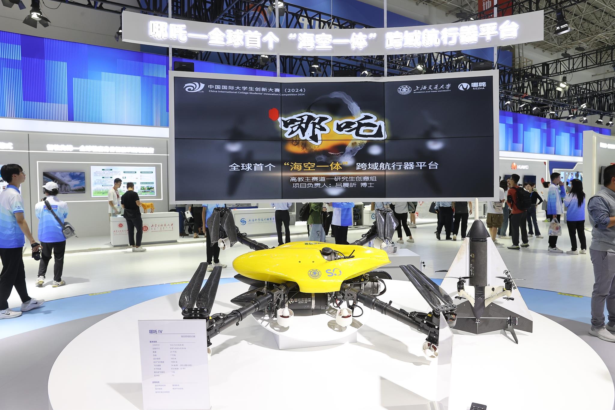 ??△2024年10月12日至15日,中國(guó)國(guó)際大學(xué)生創(chuàng)新大賽總決賽及同期活動(dòng)在上海舉行。來自上海交通大學(xué)的“哪吒——全球首個(gè)‘??找惑w’跨域航行器平臺(tái)”項(xiàng)目奪得冠軍。