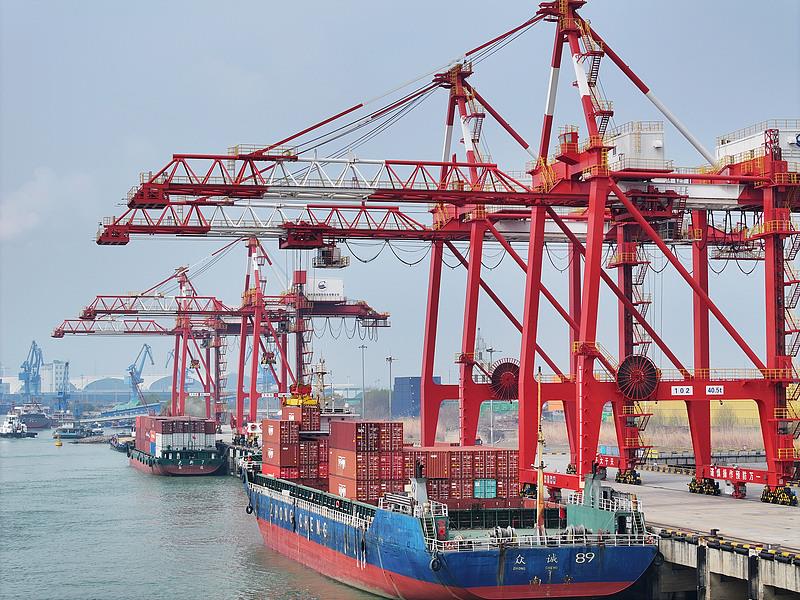 ??△江蘇揚(yáng)州港,貨輪靠泊在港口裝卸貨物。