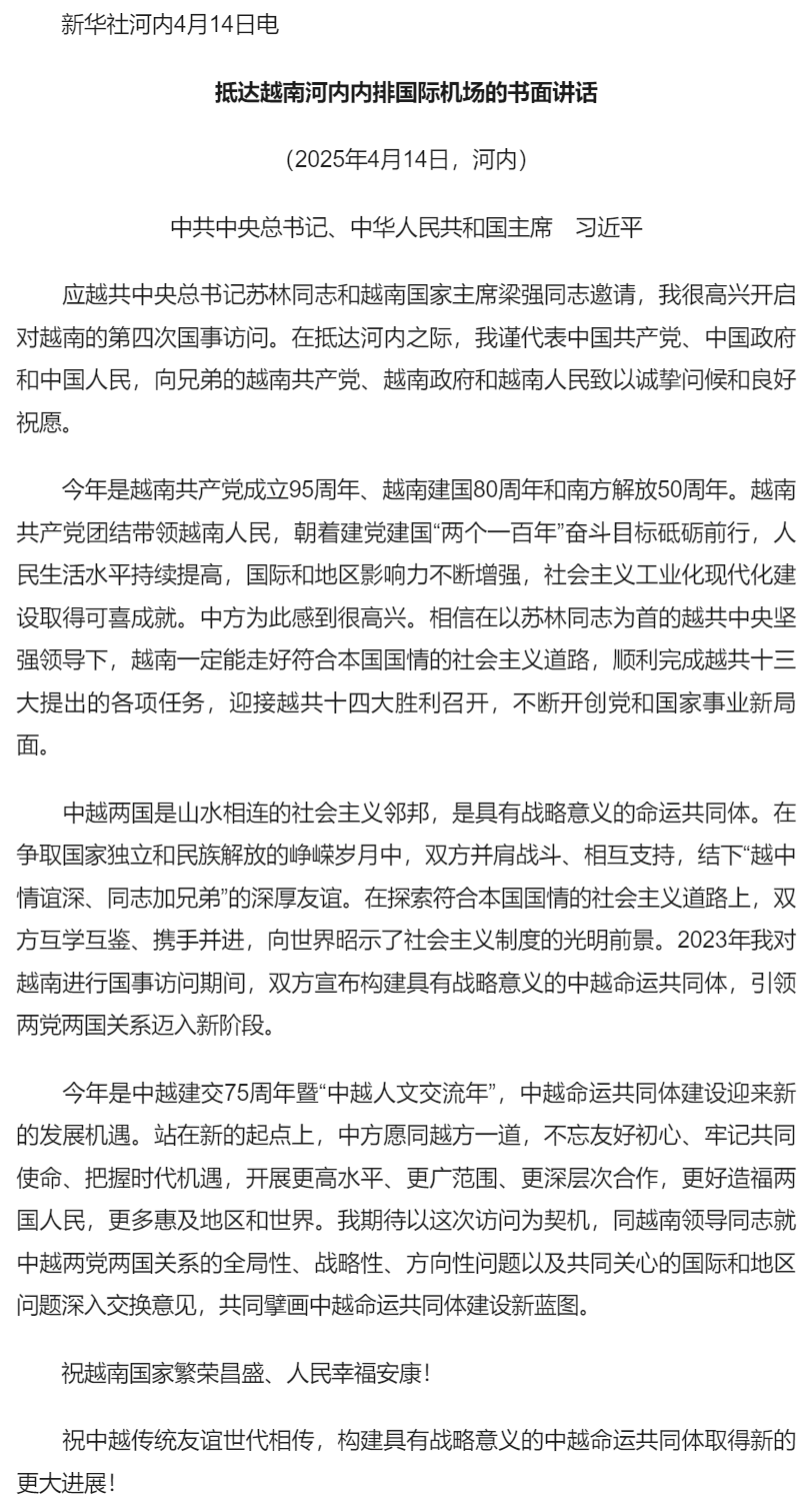 習(xí)近平抵達(dá)越南河內(nèi)內(nèi)排國(guó)際機(jī)場(chǎng)發(fā)表書(shū)面講話