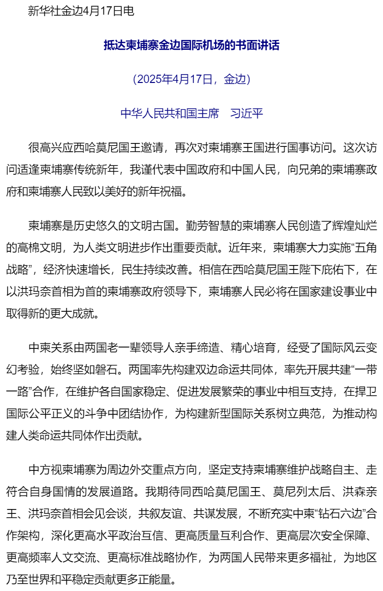 習近平抵達柬埔寨金邊國際機場發(fā)表書面講話