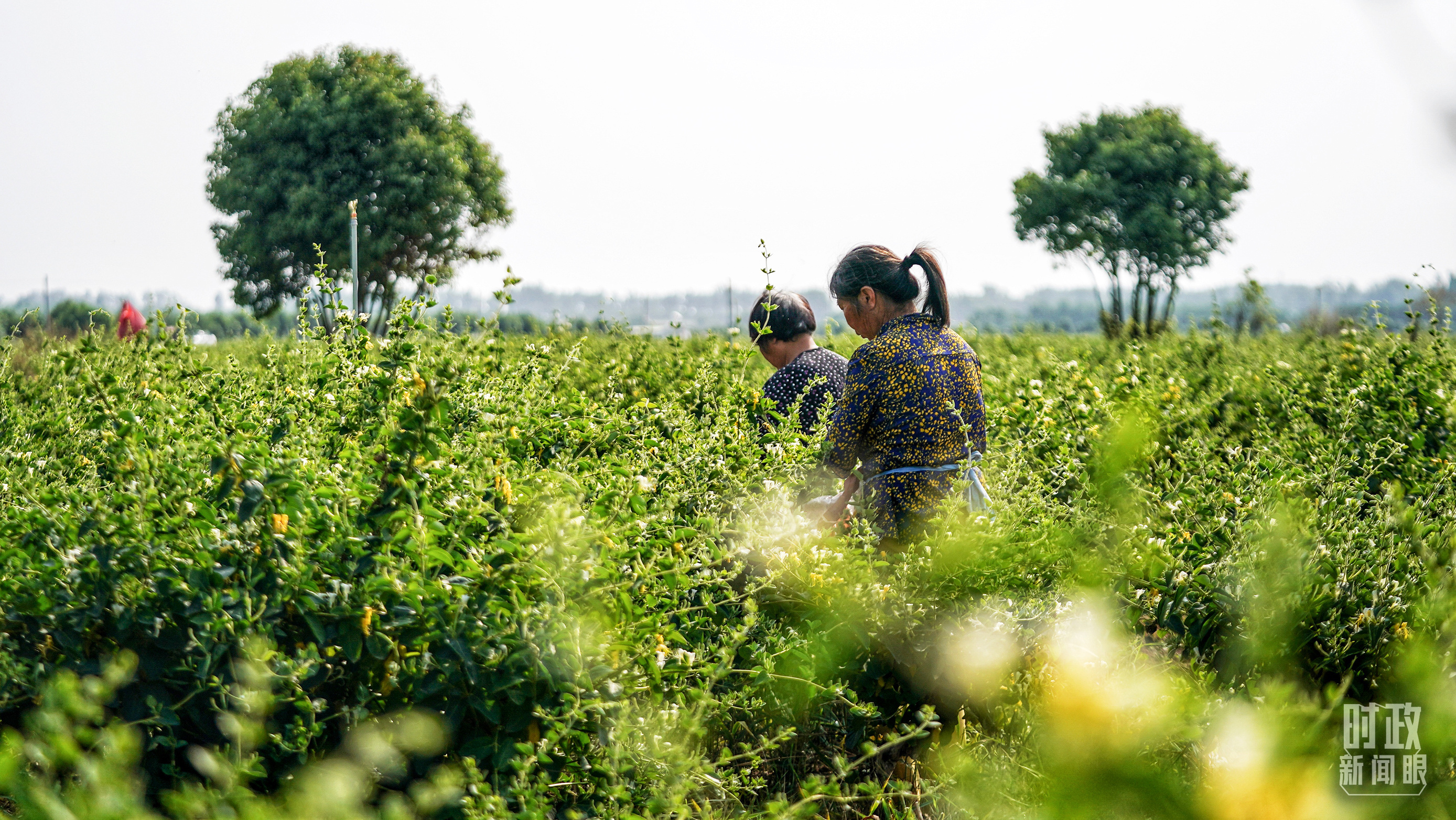 ??△五月,河南農(nóng)民采摘金銀花。(總臺(tái)國(guó)廣記者李晉拍攝)