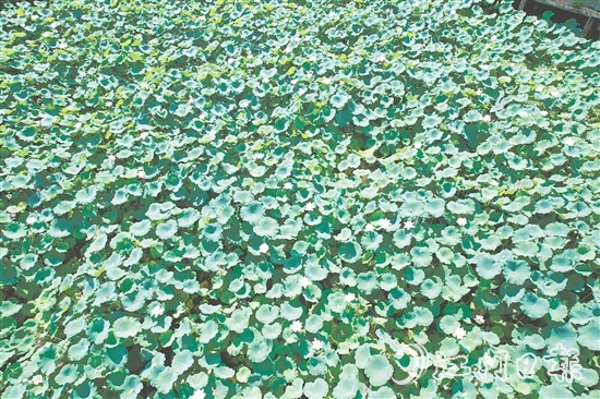 ????記者昨日經(jīng)茶庵古寺門坊,沿蜿蜒的石板路前行,只見荷花池中,荷葉田田,層層疊疊,粉色的、白色的荷花在綠色荷葉間亭亭玉立,與古寺的飛檐斗拱相互映襯,美麗如畫。