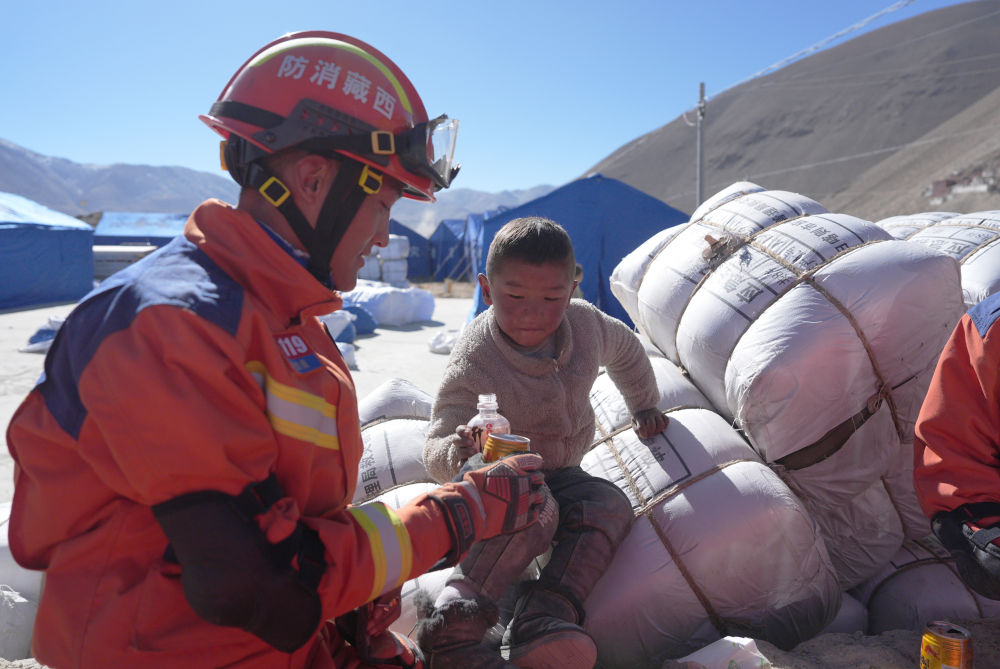 ??2025年1月8日,在西藏定日縣措果鄉(xiāng)塘仁村安置點,消防救援人員和小朋友互動。1月7日,西藏日喀則市定日縣發(fā)生6.8級地震。新華社記者 晉美多吉 攝