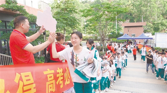 老師們列隊(duì)送考,通過擊掌傳遞鼓勵(lì)與祝福。