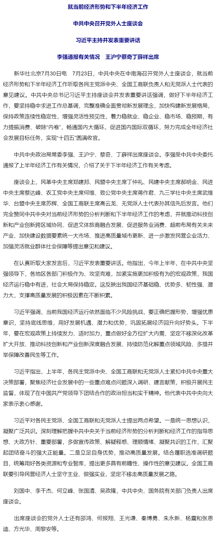 就當(dāng)前經(jīng)濟(jì)形勢(shì)和下半年經(jīng)濟(jì)工作 中共中央召開(kāi)黨外人士座談會(huì) 習(xí)近平主持并發(fā)表重要講話