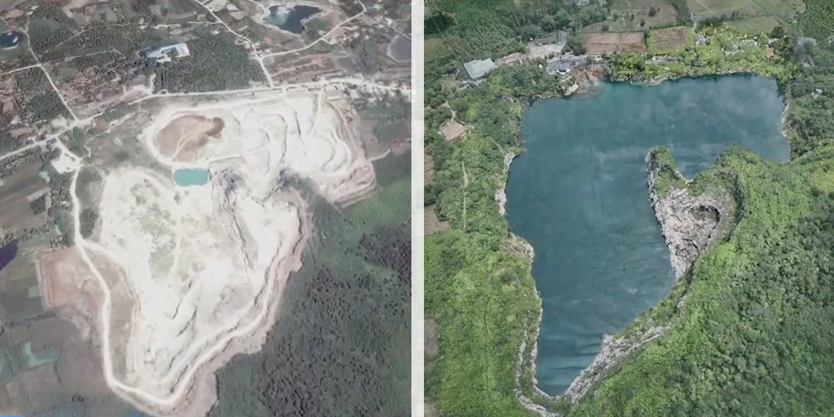 ??△浙江安吉曾經(jīng)最大的石灰?guī)r礦坑復(fù)綠改造后,變成有山有水的生態(tài)度假區(qū)。