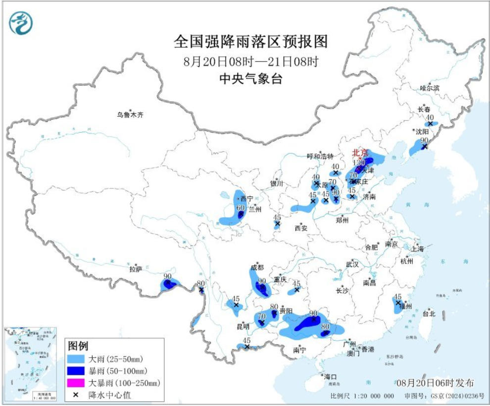 ??預(yù)計(jì),8月20日08時(shí)至21日08時(shí),遼寧東部、吉林東南部、青海東部、甘肅南部、陜西北部、山西、北京東南部、天津、河北中南部和東北部、四川盆地西南部、貴州西部和南部、云南北部和東南部、福建中東部、廣西北部、廣東西北部等地的部分地區(qū)有大到暴雨,其中,河北中部等地局地有大暴雨(100~130毫米)。上述部分地區(qū)伴有短時(shí)強(qiáng)降水(最大小時(shí)降雨量20~50毫米,局地可超過(guò)60毫米),局地有雷暴大風(fēng)等強(qiáng)對(duì)流天氣。