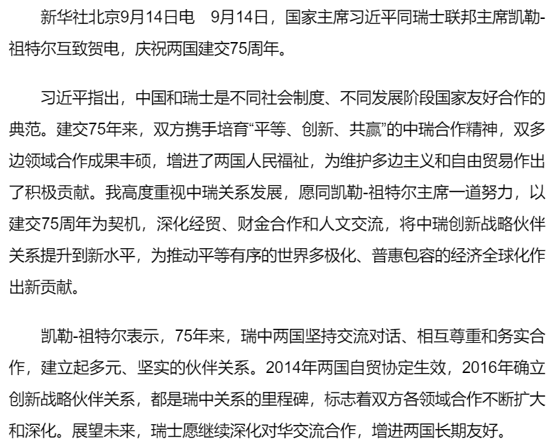 習(xí)近平同瑞士聯(lián)邦主席凱勒-祖特爾就中瑞建交75周年互致賀電