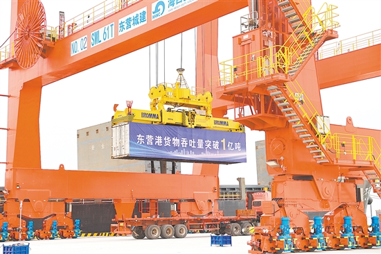 ????圖為12月22日,裝載集裝箱的“萬木春32”貨輪在東營港集裝箱碼頭停靠接卸。