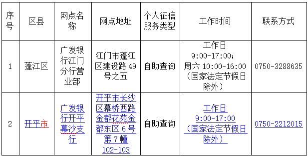 近年來,廣發(fā)銀行江門分行踐行“征信為民”服務(wù)理念,不斷提高征信服務(wù)水平,助力推進本地征信服務(wù)體系建設(shè)。截至目前,該行已分別在廣發(fā)銀行江門分行、廣發(fā)銀行開平幕沙支行布設(shè)個人征信報告自助查詢機,提供個人信用報告查詢服務(wù)。查詢機查得的個人信用報告與人民銀行查詢機查詢結(jié)果一致,廣大市民群眾可攜帶本人有效身份證就近前往查詢點查詢打印征信報告。具體查詢地址及服務(wù)信息如下: