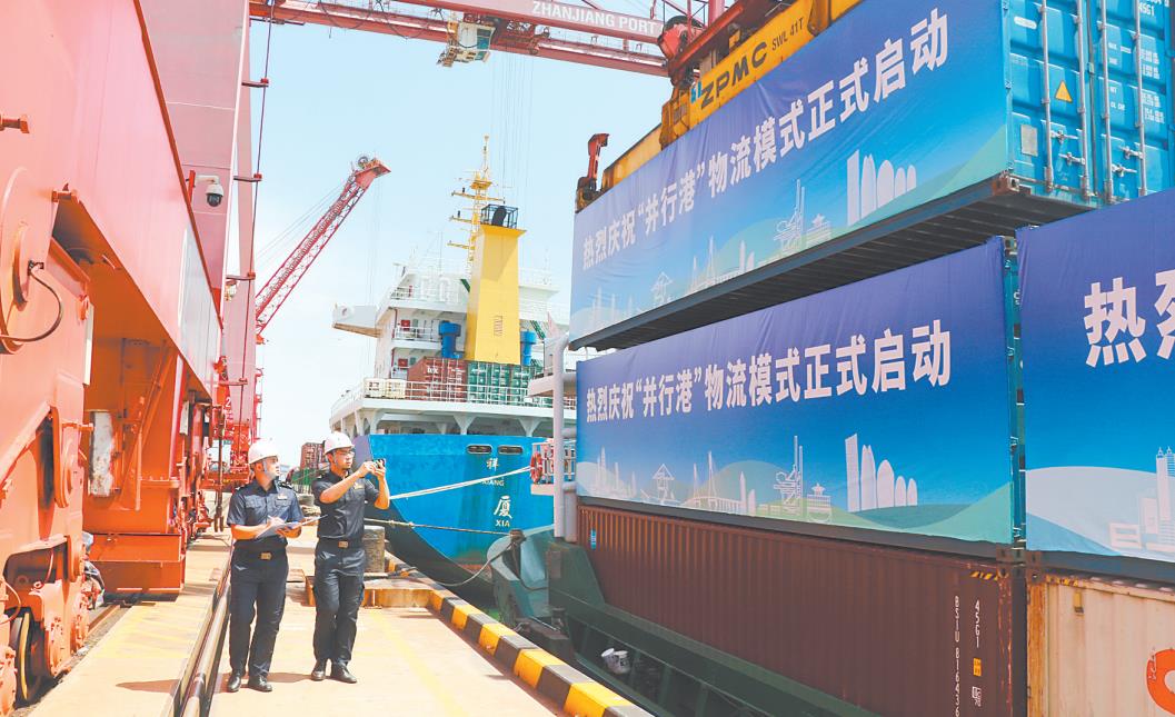 9月26日,“南航757”輪船自廣東湛江港啟航,將途經(jīng)海南洋浦港、深圳蛇口港,卸裝集拼三地的內(nèi)外貿(mào)貨物,最終前往亞歐國家。這標(biāo)志著“并行港”物流模式改革試點(diǎn)首票業(yè)務(wù)成功開通。模式成熟運(yùn)營后,預(yù)計(jì)三港間船舶裝載率將由30%提升到最高80%,投入運(yùn)力減少50%以上,集裝箱物流成本大幅降低,為粵港澳大灣區(qū)和海南自貿(mào)港聯(lián)動(dòng)發(fā)展增添新動(dòng)能。這種模式對(duì)江門也是一種有益的啟示。新華社發(fā)