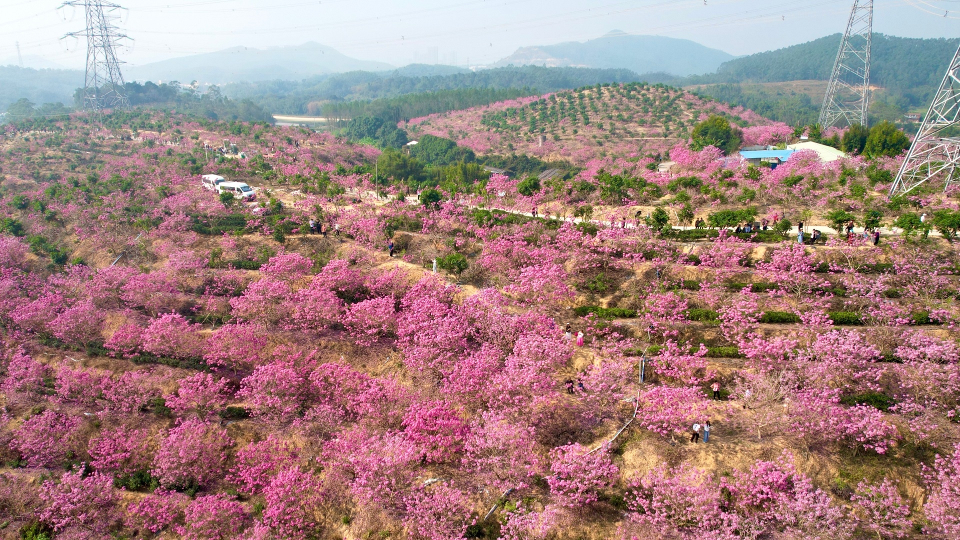 12月24日,鶴山萊蘇(鴻園)山水人家旅游景區(qū)內,500余畝紫花風鈴木迎來最佳觀賞期。雖是工作日,但仍有不少廣州、惠州等地的游客專程驅車前來,沿著觀景步道漫步、拍照打卡。