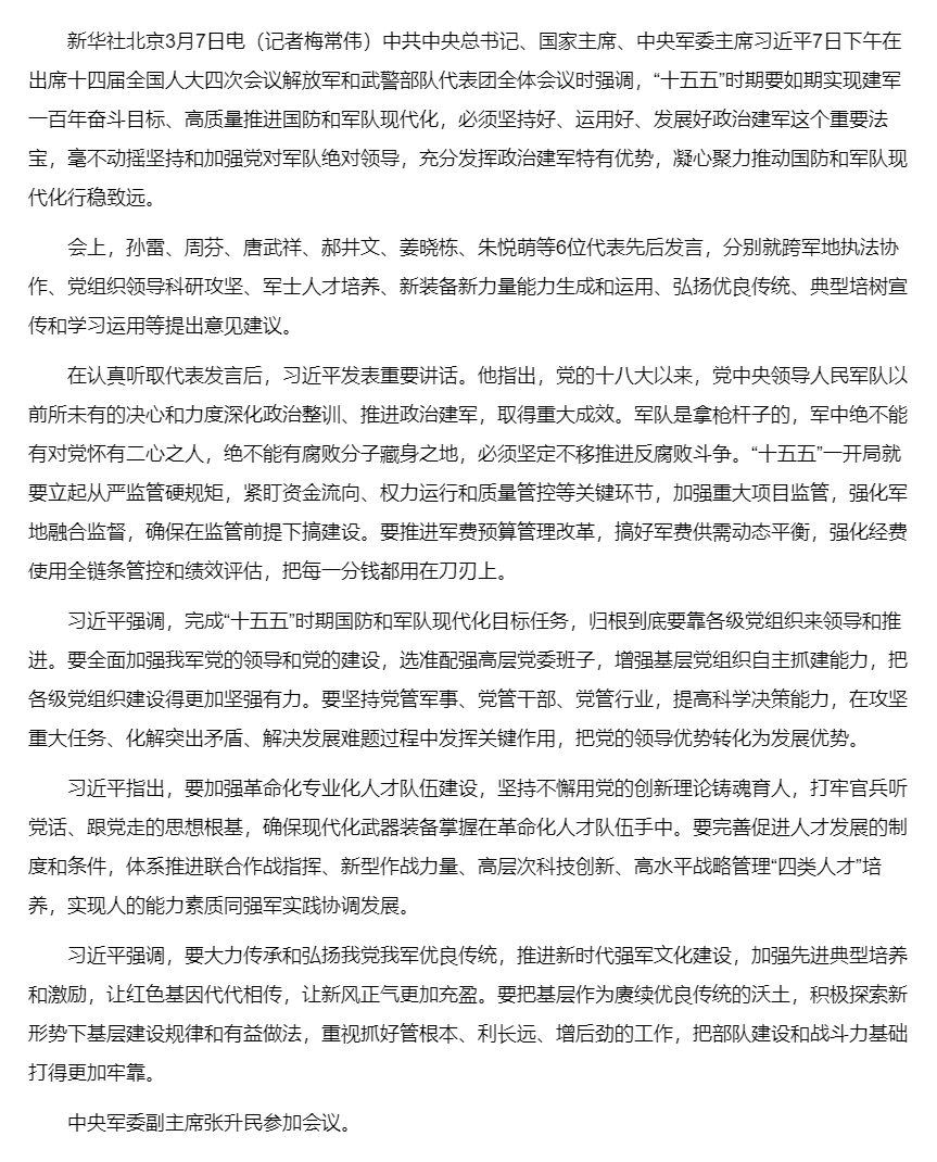 習(xí)近平在出席解放軍和武警部隊代表團(tuán)全體會議時強(qiáng)調(diào) 充分發(fā)揮政治建軍特有優(yōu)勢 凝心聚力推動國防和軍隊現(xiàn)代化行穩(wěn)致遠(yuǎn)