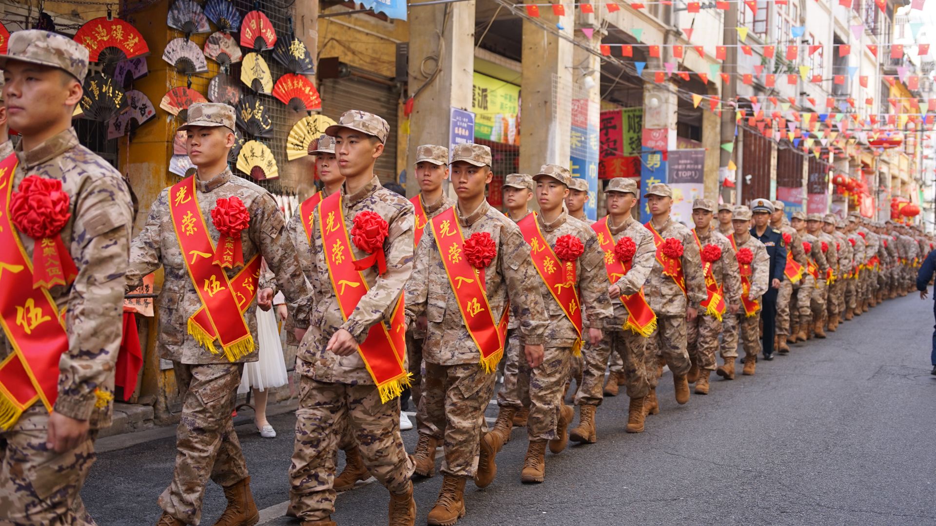 今年,江門首次組織新兵巡游。在長堤歷史文化街區(qū),新兵們接受著鄉(xiāng)親們的注目。鑼鼓聲震得人耳朵嗡嗡響,醒獅在人群中翻騰,孩子們騎在父親肩上,咿咿呀呀地拍手。來自五邑大學(xué)的女兵溫泳詩站在隊伍里,看了一眼那些醒獅,又低下頭,看自己胸前的大紅花。今天,她是新兵中的一員?!凹?,更多的是期待。我要走進軍營,磨煉自己。”她笑起來,露出兩顆小虎牙。