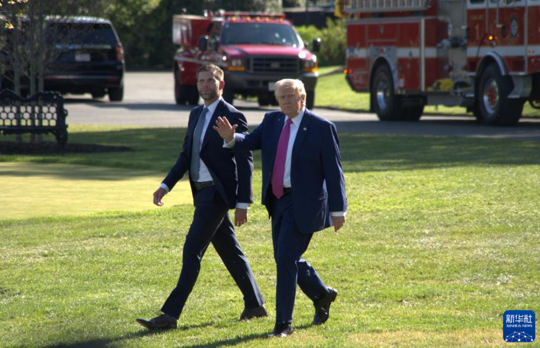 ??4月10日,美國(guó)總統(tǒng)特朗普(右)準(zhǔn)備乘直升機(jī)離開(kāi)華盛頓白宮。新華社發(fā)(李源清攝)