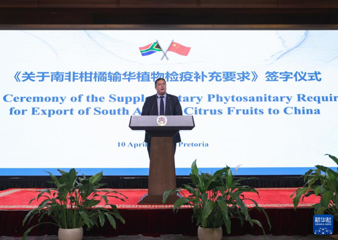 ??4月10日,在南非比勒陀利亞,南非農(nóng)業(yè)部長(zhǎng)斯廷黑森在《關(guān)于南非柑橘輸華植物檢疫補(bǔ)充要求》簽字儀式上致辭。新華社記者 陳為 攝