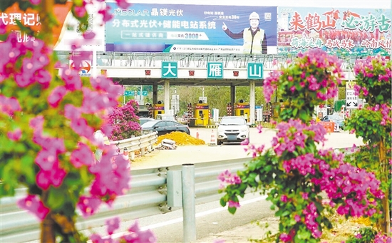 在大雁山高速出入口,道路兩側的簕杜鵑等植物為城市門戶增色。