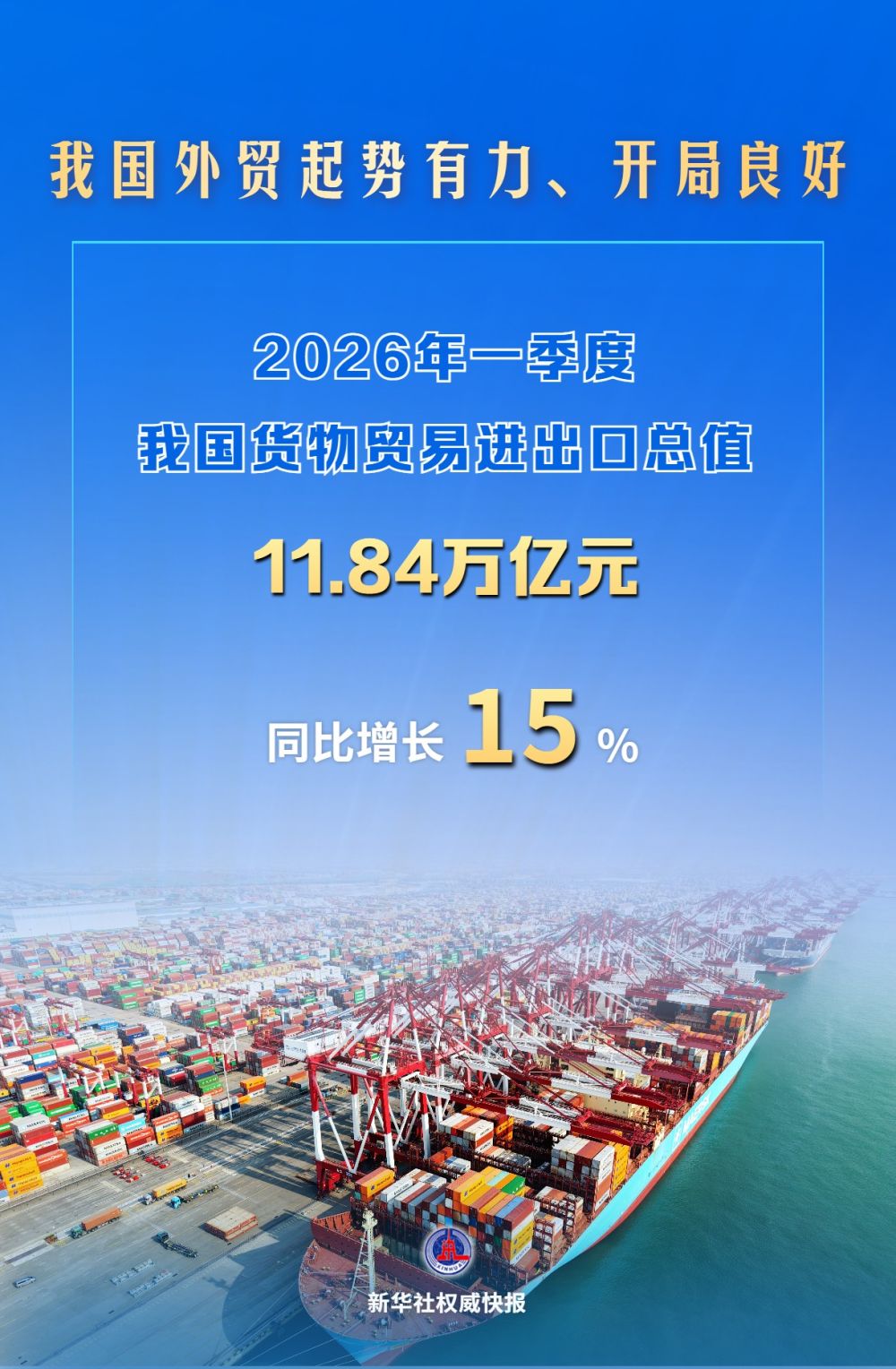 海關總署4月14日發(fā)布數(shù)據(jù)顯示,2026年一季度我國貨物貿(mào)易進出口總值11.84萬億元,歷史同期首次超過11萬億元,同比增速保持兩位數(shù)增長,達到15%。