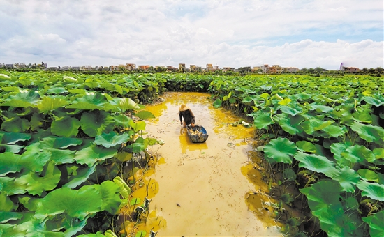 7月,新會(huì)的天氣炎熱,即便是坐在陰涼的大樹(shù)底下,也讓人直冒汗?,F(xiàn)在正是大鰲鎮(zhèn)蓮藕收獲的季節(jié),在這里的蓮藕塘中是一片熱火朝天忙碌的景象。