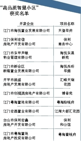 ????總的來(lái)說(shuō),在本次評(píng)選中,本地的幾個(gè)實(shí)力房企,如博富控股旗下的博學(xué)名苑和福美壹號(hào)名苑,海悅集團(tuán)旗下的天璽華府、海悅尚珩華庭和海悅東晟新苑,錦富匯景灣豪庭,駿景灣集團(tuán)旗下的駿景灣濱江譽(yù)峰園和駿景灣悅峰花園,怡福地產(chǎn)旗下的東華名岸園、星湖壹號(hào)院、博薈苑,以及半島華庭二沙島豪苑、潮聞東方北苑、翡翠觀瀾花園等,都名列前茅。另外,外來(lái)龍頭房企,如保利、碧桂園、粵海在江門(mén)的項(xiàng)目也榜上有名。