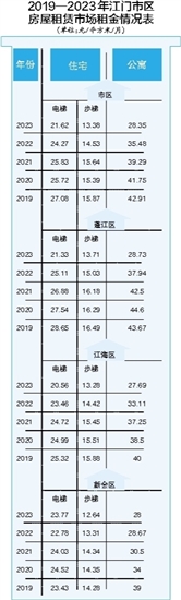 ????再來(lái)看看市區(qū)公寓用房租金的情況,蓬江區(qū)為28.73元/平方米/月,江海區(qū)為27.69元/平方米/月,新會(huì)區(qū)為28元/平方米/月,三區(qū)差別不明顯,但同樣從2019年起租金總體呈下降趨勢(shì)。以蓬江區(qū)為例,2019年公寓用房租金高達(dá)43.67元/平方米/月,2023年下降至28.73元/平方米/月。也就是說(shuō),在蓬江區(qū)租住一間50平方米的公寓,2019年的時(shí)候月租需要2183.5元,2023年則只需要1436.5元。