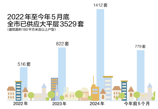 ????先來看一組數(shù)據(jù)。記者從市住房城鄉(xiāng)建設(shè)局了解到,2022年,建筑面積在180平方米及以上的大平層戶型全市供應(yīng)量516套,占比1.4%;2023年全市供應(yīng)量822套,占比2.9%;2024年全市供應(yīng)量1412套,占比5.4%;到了2025年,1—5月供應(yīng)量就達(dá)到779套,占比提高至9.8%。不難發(fā)覺,大平層在我市的供應(yīng)量一直在提升。短短三年間,大平層供應(yīng)占比就提升了3倍左右。