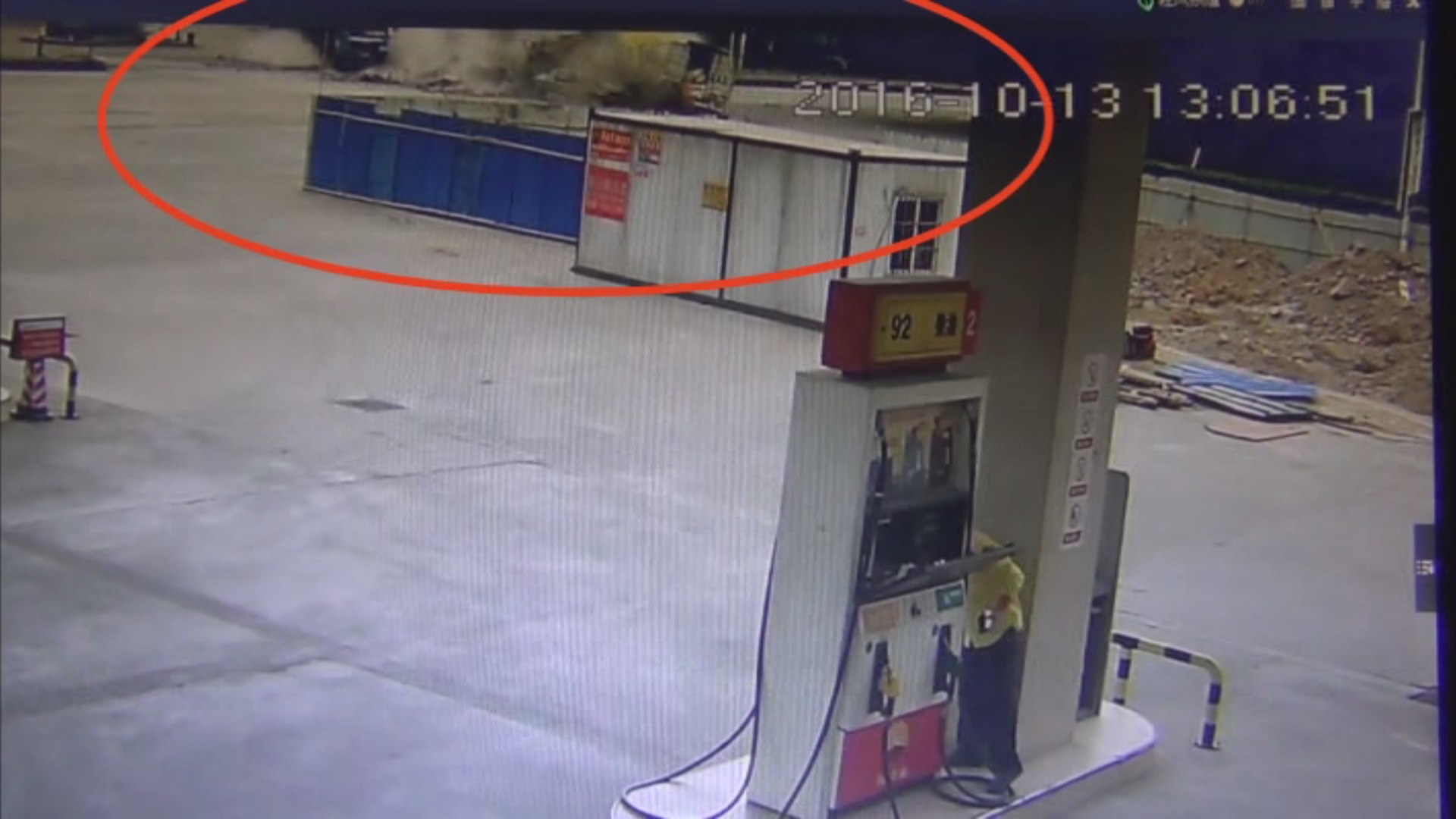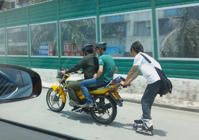 兩男子在前面駕乘摩托車,另一男子不戴頭盔,拉著摩托車尾進(jìn)行輪滑運(yùn)動,搭“順風(fēng)車”的同時還不忘玩玩手機(jī)。